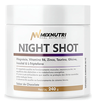 Com sabor irresistível de chocolate, o Night Shot foi formulado para estimular a produção natural de Melatonina, promovendo relaxamento, sono de qualidade e redução do estresse de forma natural. A Glicina atua no relaxamento do sistema nervoso, enquanto a Vitamina B6 é essencial para a conversão do Triptofano em Serotonina e, posteriormente, em Melatonina, o hormônio do sono.